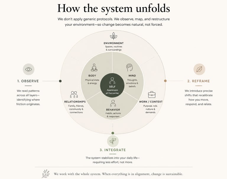 We read patterns across body, behavior, and environment—identifying where friction originates.
